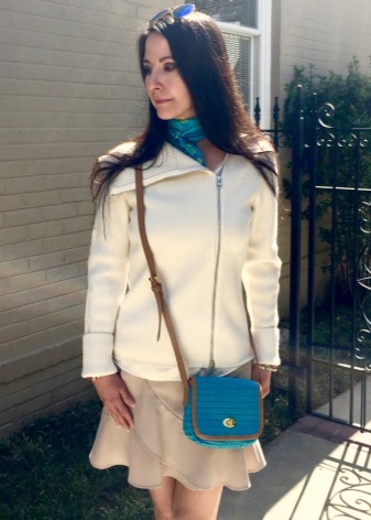 When combining a scarf with warm outerwear (coat, cardigan, down jacket), it is worth considering the option of placing it on top of it. The combination of white clothes with a turquoise accessory has a special charm.