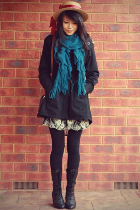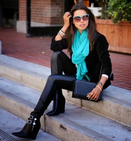 You can’t calmly pass this image, it is so attractive and amazing. Although the whole secret is hidden in this turquoise scarf that perfectly shades black. Still, in the accessories there are great opportunities that must be used when creating original images.