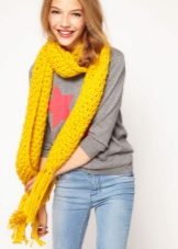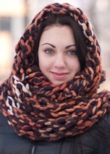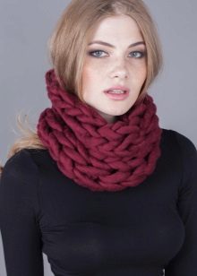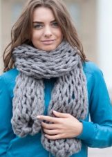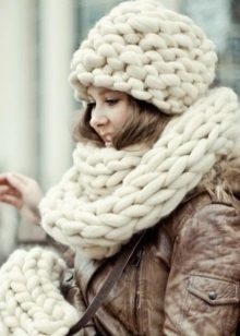 From bulk yarn. Bulk yarn is a true bestseller in needlework stores. It is used to create sweaters, hats and scarves. The latter, knitted from such yarn, take on a hypertrophied appearance, giving the figure fragility and femininity.