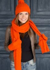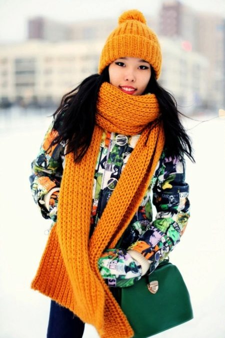Another option for a knitted volume scarf for winter is a bright orange tint in combination with a multi-colored jacket creates an image that perfectly dilutes gray city everyday life.