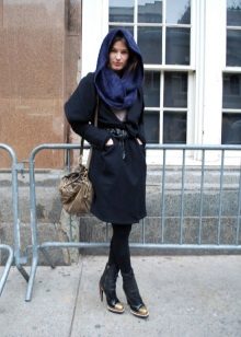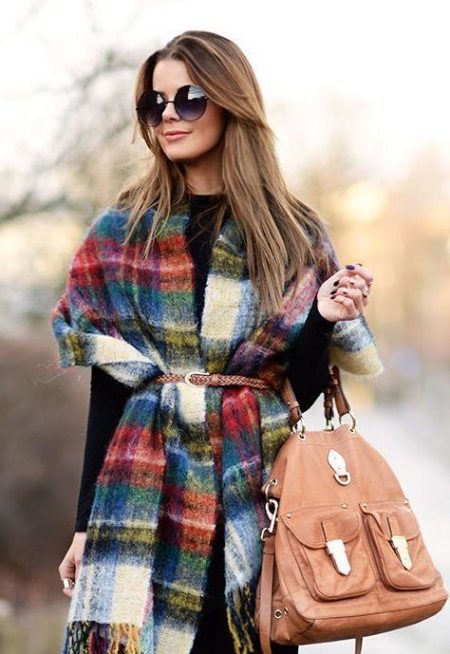 One of the ways to wear a large scarf is clearly presented - as a cape. A wonderful look for everyday wear, all the details look concise, and the scarf focuses on the background of black things. The bow is suitable for walking around the city, as well as visiting shops, cafes and cinema.
