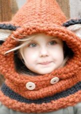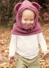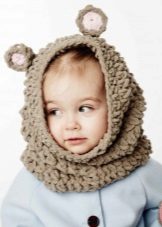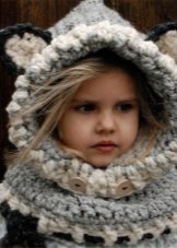For mom, this will be a great opportunity to realize her creative potential, and the baby will get an unusual winter thing in which he wants to walk again and again in the yard in any weather. For example, a snood hood similar to a hood made of red yarn with ears will make a chanterelle out of your crumbs, and a gray wolf cub.