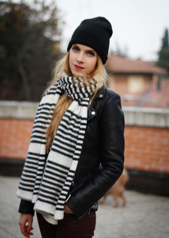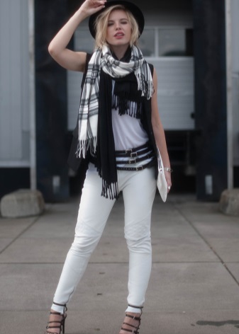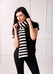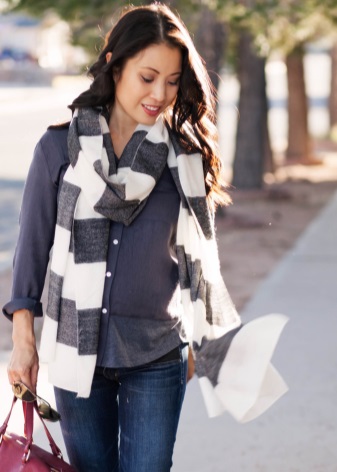 - A classic solution is a black and white scarf. It can be in a cage, strip, peas, etc. Such a model will harmoniously fit into any image. The combination of black and white is suitable for all women.