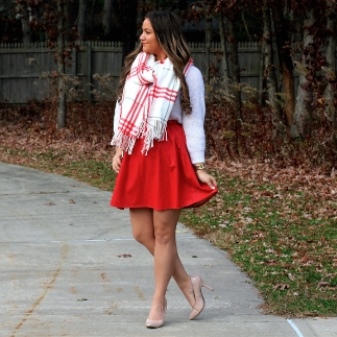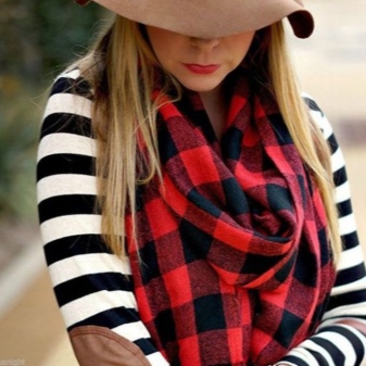 - A red-black or white-red scarf looks spectacular and bright. Red color always gives clothes brightness and saturation. Such a scarf can be safely worn with clothes presented in cool colors.