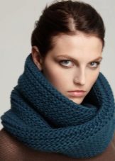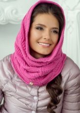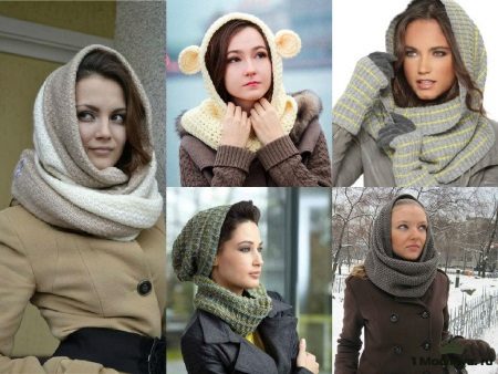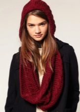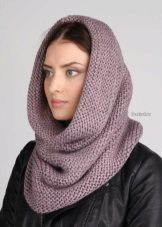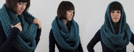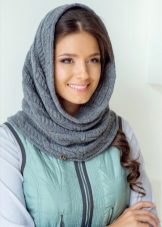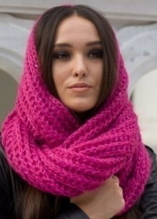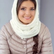 The third way - use in the form of a scarf and hat at the same time. Throw a broadband scarf around your neck, wrap it in the form of a figure eight, and then throw one of the loops on your head, spreading the scarf on your head like a bonnet. Thus, you get a kind of knitted hood, and the head will be reliably protected from gusts of wind. A scarf-snood dressed in this way visually lengthens the face.