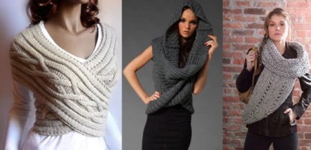 - Like a vest - cross crosswise. To put a scarf-pipe like a vest, you need to put your hands in a scarf, cross the scarf in front, forming a figure eight, straighten the canvas on the shoulders and on the belt behind. Important note: for the scarf to be wrapped around the body in this way, it must be of sufficient length.