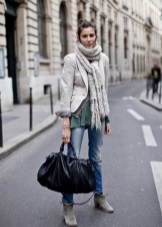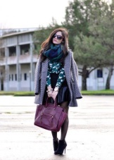 One of the classic ways - tying a scarf on one knot, you should wrap it around the neck several times. So that the scarf knot does not spoil the overall picture, it can be masked by straightening the scarf on one side. The asymmetric emphasis on one shoulder looks very elegant.
