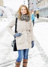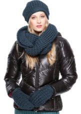 For an embodiment of everyday style, a snood in an ensemble with a down jacket will be an excellent solution. With a short model of outerwear, scarfs-hoods of calm colors look better, such as gray, white or dark blue. To add extravagance to the image, it is worth paying attention to the bright clamps. A scarf-hood is usually worn over the down jacket. The ends of the scarf can freely fall down or create several circles around the neck.
