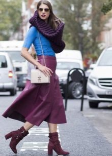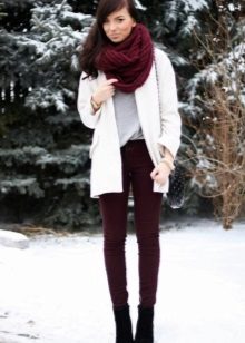 To create a bright, romantic bow, you should wear a burgundy scarf-hood in tandem with a gray shortened sweater. A striking accent of the image is ripped jeans and mustard-colored boots. The perfect complement will be a capacious handbag in the tone of shoes.