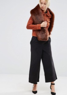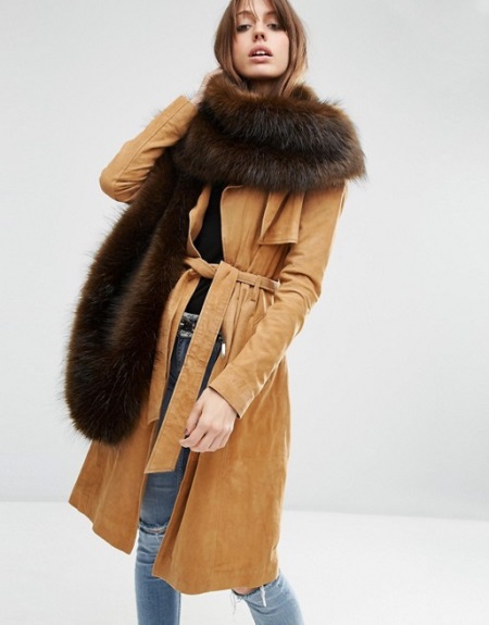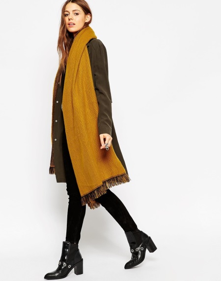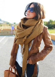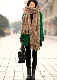 Scarf brown shade perfectly combined with any kind of outerwear. The question of how to wear such a scarf when it is already warm enough on the street will not catch you by surprise, since there are many options. As the top you can wear a sweater, sweater dress or pullover, and the bottom - it can be jeans, trousers, leggings, tights. If you want to highlight a wasp waist, just put on a wide belt in a single color scheme with a scarf.