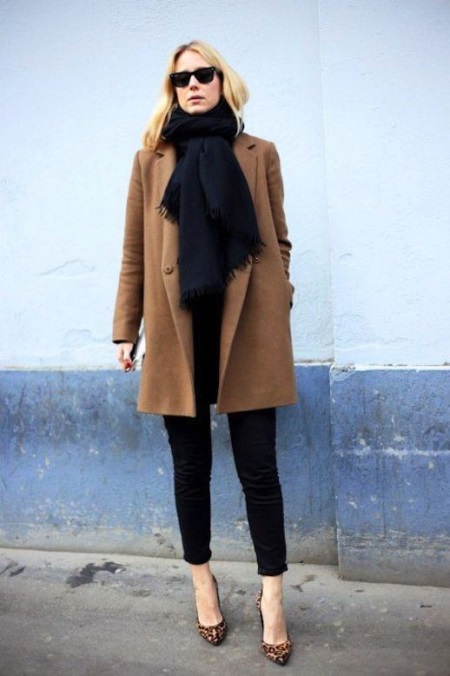 In order to make your look look stylish, you need to choose all the accessories (boots, bag, scarf, belt) in one tone. If you wear a black coat and a light brown scarf, shoes with heels or a platform, an elegant handbag, you get a very fashionable look.