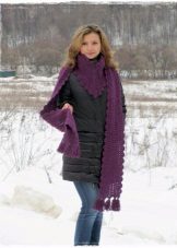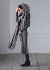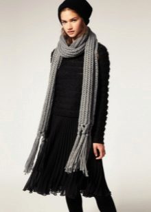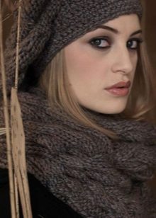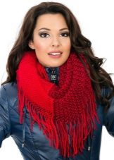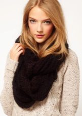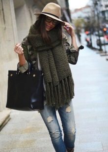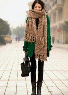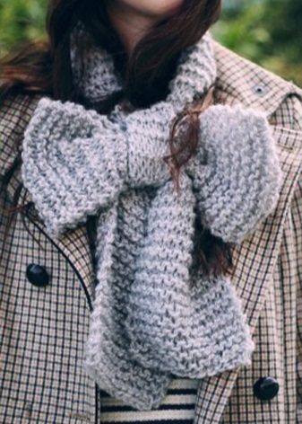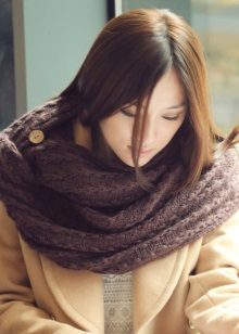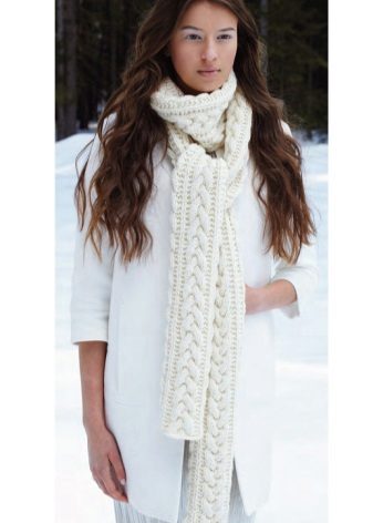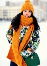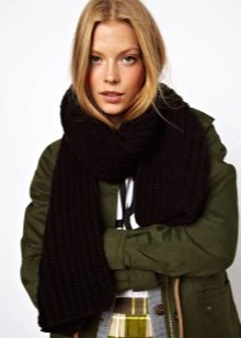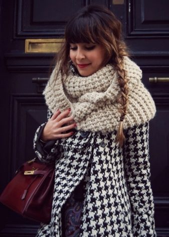 Knitted scarves can be plain so that the emphasis remains on the thread. Preference should be given to the so-called rural knitting, when the main elastic band is surrounded by pigtails, with the interweaving of thick threads. Such products are recommended to be worn, both with a classic coat, and with a jacket or down jacket.