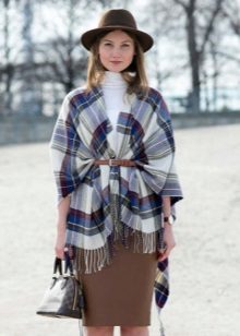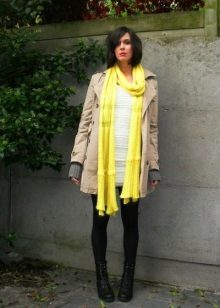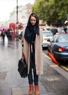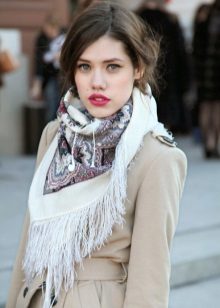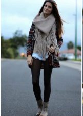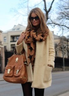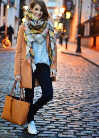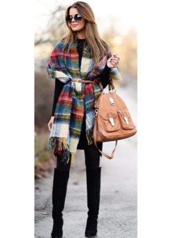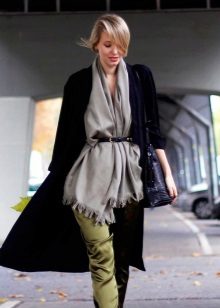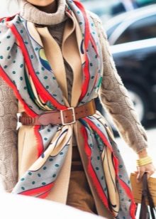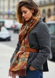 - The following decision remains very interesting this season: you need to take a bright and dense shawl, and then put it on your neck so that the ends of the accessory hang on your chest. Now they need to be belted, or tucked into an existing belt, which many models of outerwear are equipped with. It remains to spread the scarf so that the pattern is visible, and the fashionable image is ready!