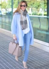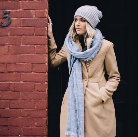 - A beige coat is complemented by gray and blue accessories. A product with a small fringe is another stylish detail of the image. This is a great solution for girls who respect pastel colors.
