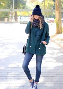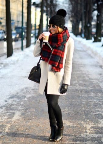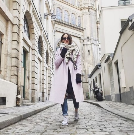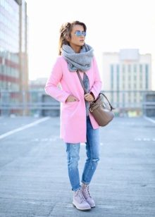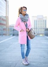 - The image of a teenager suits ladies of any age. A powdery pink coat without unnecessary details, boyfriend jeans, sneakers - all this harmonizes well with a light checked scarf. Clear lines and a certain amount of hooliganism are a fashionable solution for everyday life.