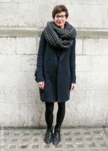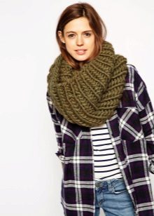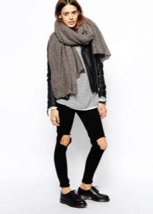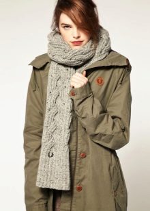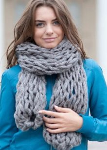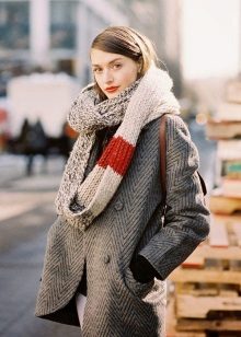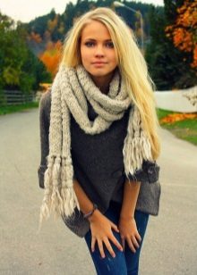 - Narrow coarse scarves. It seems that massive loops create volume, but at the same time, the accessory remains “skinny”. Having tied such a detail once around the neck, the girl becomes fashionable. It is desirable that the product was monophonic calm, classic color. It can be combined with any clothes, especially in casual style.