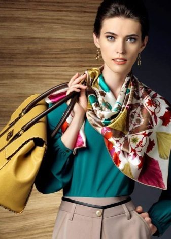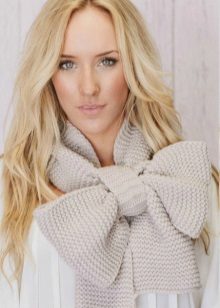 - Scarves bows. There is no better association with gifts, surprises and other pleasant trifles than romantic bows. This trend is especially relevant in the fall and spring, when you do not need to wear bulky accessories. Having tied a scarf made of light fabric in the form of a bow, you can create an image that has been blessed by designers around the world. It looks very feminine and sophisticated, and to tie a bow is not difficult.