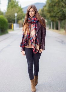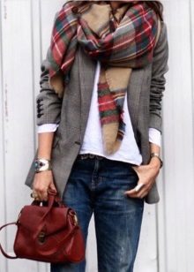 - The first image is suitable for the young ladies who preferred the tartan cage. Combined with a beige and olive jacket, gray and olive skinny jeans and a white top, this massive contrasting scarf looks amazing.