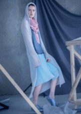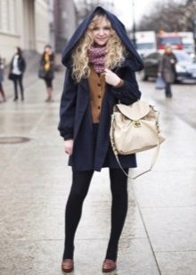 The tie knot will fit a strict coat, in this case the coat is left unfastened or the scarf is passed under the hood.