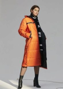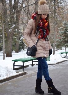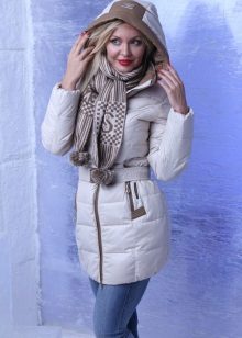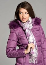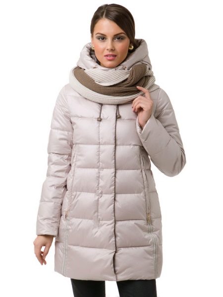 - A down-padded coat of a calm pastel shade will successfully complement a bright volumetric scarf with a contrasting flowering, scarves with a large pattern, geometric patterns, and a cage will look interesting.