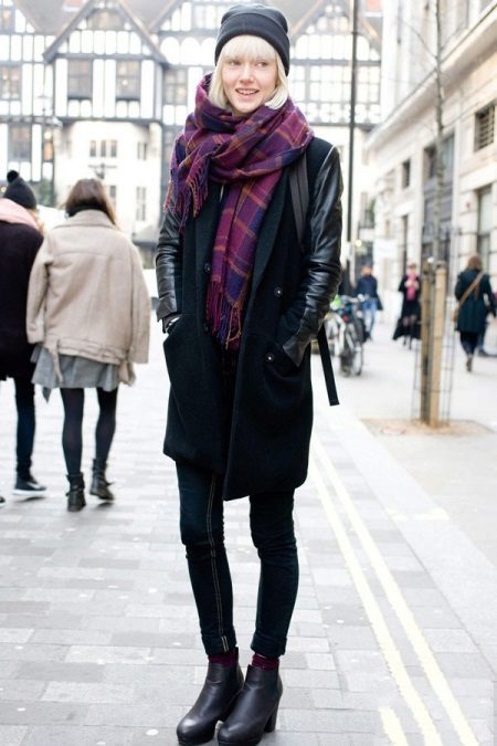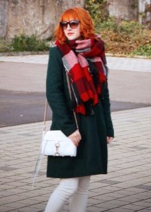 - With a shortened coat, you can wear both soft fabric and long knitted scarves. Solid color or checkered is acceptable.
