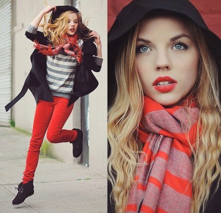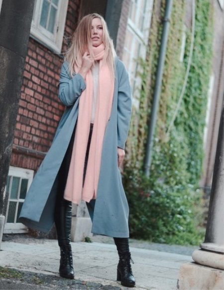 The unbanal combination of turquoise and pink looks very lyrical. A delicate pink long scarf will emphasize your femininity and velvety skin, hiding minor imperfections. Long ends combined with an open long coat will add harmony. Great for a date.