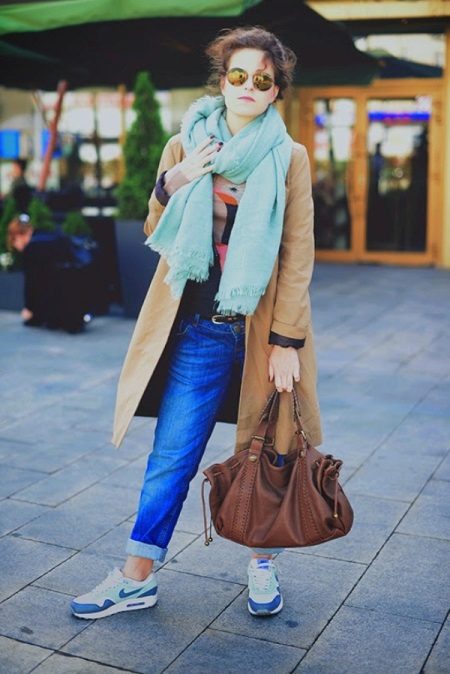 - With a double-breasted coat, short and light decorative scarves made of silk or chiffon look great, both bright and pastel colors that hide under clothes.
