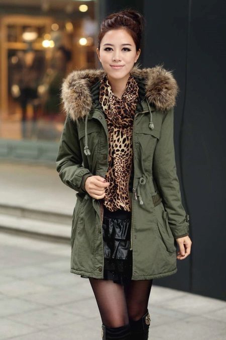 Add a soft leopard scarf to your khaki jacket trimmed with brown fur. If you unfasten your jacket, you will notice a graceful French knot.