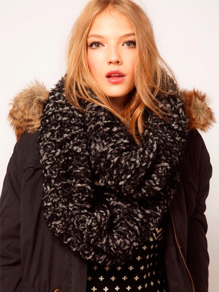 - With a short fitted down jacket, a snood will look great.