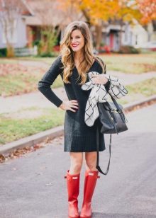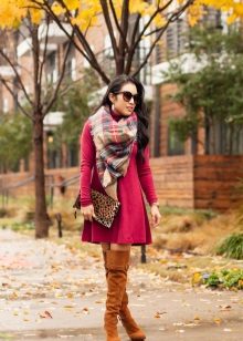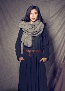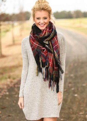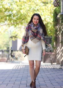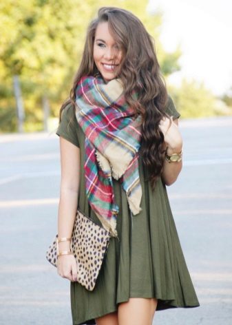A woolen scarf will complement a dress made of knitted fabric, a brightly colored product will radically transform a simple casual dress of medium length.