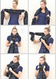 - From a large scarf, you can make a tourniquet. As in the previous version, fold it diagonally and throw it over your shoulders like a shawl. Tie the hanging ends into a light knot and wrap around the neck. This option is well suited for cold weather, when you want to warm up as much as possible.