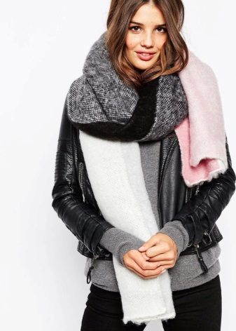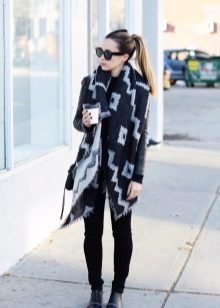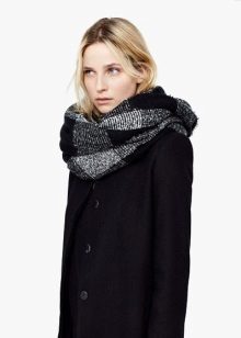- A volume shawl looks great with a black jacket or fitted coat. It is enough to fold it diagonally and throw the ends over the neck, leaving them hanging down on the sides. You can also hide them under the main canvas of the scarf, giving it an even larger volume.