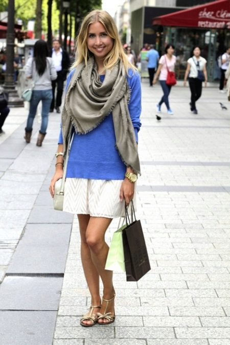 - In the spring, use a lightweight cotton or linen scarf to complement the delicate feminine look. Airy mini skirt, blue jumper, sandals and a handbag with a long strap. If it’s cool outside, put on thin tights and replace sandals with loafers or pumps with medium heels.
