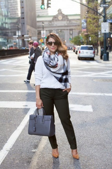 If you prefer casual style, a bright scarf will easily complement your everyday look. Complement your look with a solid jumper and comfortable neutral loafers. Particularly brave girls can also complement the image with a fedora hat, which will become a real highlight of the image.