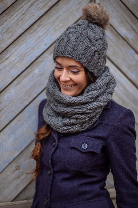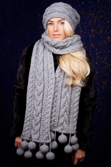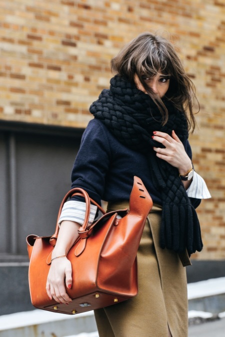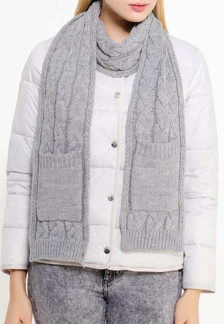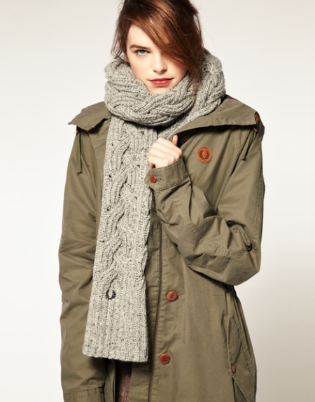 You can combine such an accessory with things of a strict, concise, simple cut. It can be a coat or a short coat. Volumetric scarves with large braids look very comfortable and at home, somewhat careless, due to which the whole image will not be so strict. Scarves can be selected to match the outerwear or, conversely, contrasting colors. The number of things with which you can wear voluminous knitted scarves with braids, and the styles in which they are appropriate - a large number. Such scarves can be worn both on the outer clothing and under it.