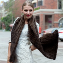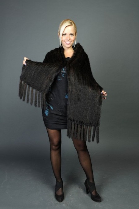 Fairly budgetary and, at the same time, a very beautiful and effective option. Mink skin is divided into narrow strips, then they are braided with a mesh base. It turns out a soft, warm knitted fabric. Thus, it is possible to knit various, even quite complex relief and flat patterns. The scarf turns out to be openwork and very light. It can be wide or narrow, it can be put on shoulders or nicely tied around the neck.