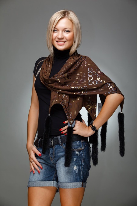 Another option for the decorative design of the scarf is mink tails. Typically, such models are used as a spectacular and expensive addition to the evening outfit and are thrown over your shoulders like a tippet.