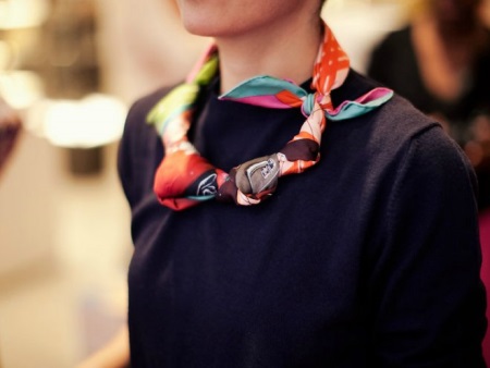 - In the case when your clothes have a V-shaped neckline or assembly, a scarf necklace should be tied in the same way, but at the same time bandage the free ends under the necklace.