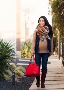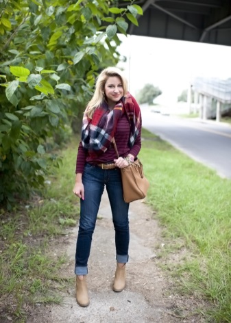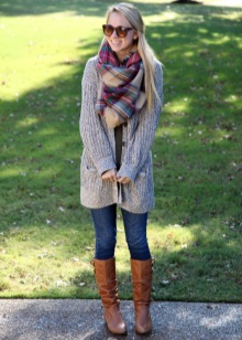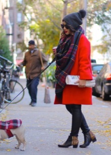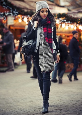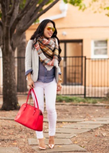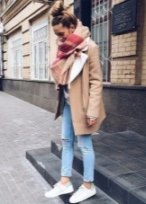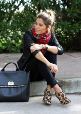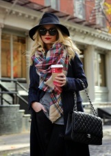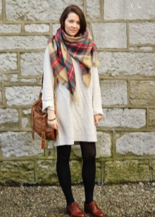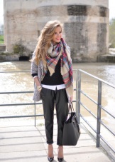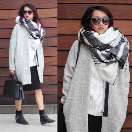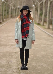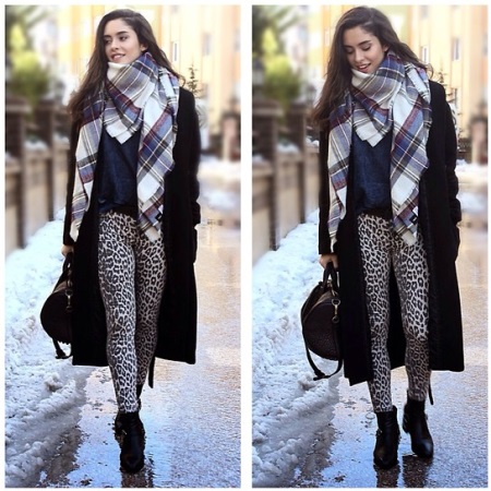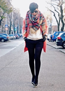 A combination with a straight cut coat will be an excellent tandem. Business style can be supplemented with a plaid folded in length and thrown over the neck with freely falling ends. This option will look great with a short coat, a jumper and tight-fitting leggings.