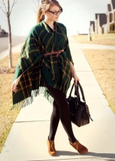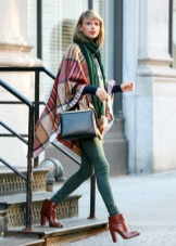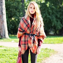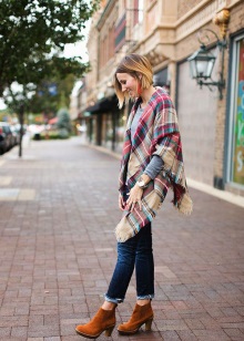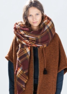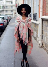 Variations in the design of the accessory make it possible to complete such an original project as a poncho. The plaid is thrown over the shoulders and straightened, turning into outer clothing. The trend model is fixed by a belt at the waist and looks spectacular with tight-fitting trousers and a sweatshirt. With a large width of the plaid, it can be folded in half, wrapped around the neck and fixed with a large pin.