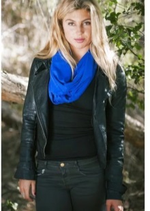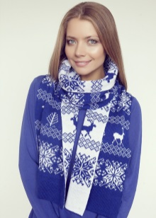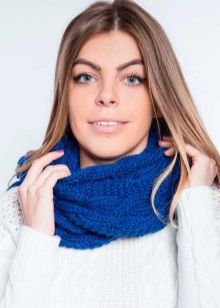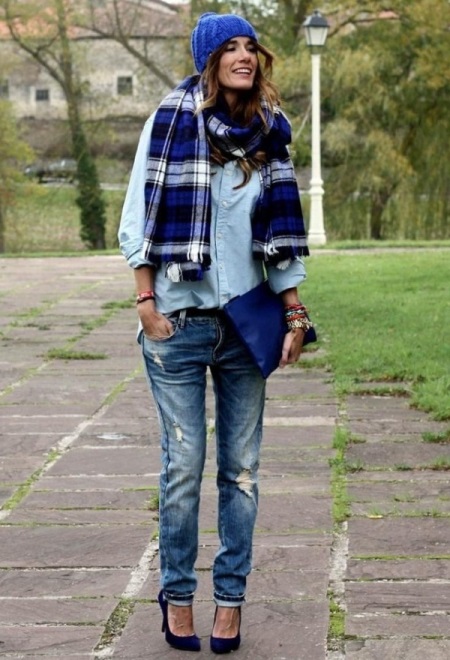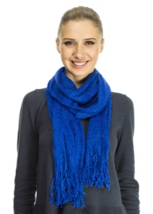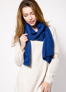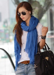 - The texture of the blue scarf and other elements of the wardrobe may be different. A massive knitted scarf will enter into a perfect symbiosis with knitted t-shirts and light shirts.