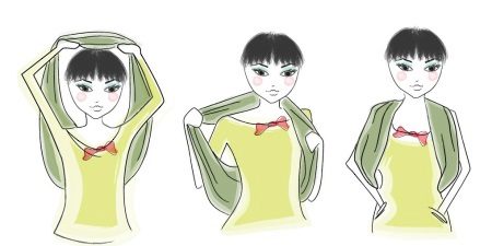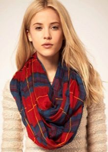 Usually girls wear snood like a hood, thus replacing a hat and scarf. He wears it like this - we throw the canvas on two hands and turn one of them to make an eight, and fold it in half. Put the resulting two circles on the neck so that the place of crossing the loops is in front. Then one of them throws itself over his head.