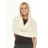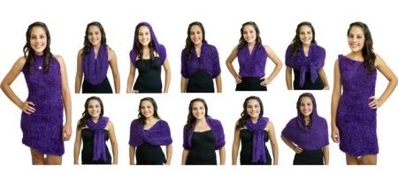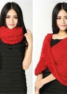 Under the name of a transformer scarf, Chinese-made snoods made of fluffy yarn “grass” are widely represented on the Russian market. Soft, very voluminous, often with a molting pile of acrylic of poor quality. They are sold on the Ali-Express website, in the Oriflame catalog and on store shelves. Very warm, they are simple and unpretentious in leaving. Easy to stretch in all directions due to the loose structure and do not hold shape. As a result, they can be a scarf, and a wrap, and a dress. Lose density when stretched, so a dress from such a scarf may be translucent.