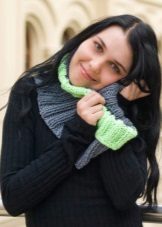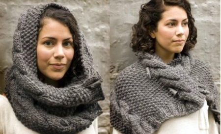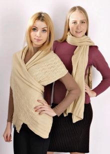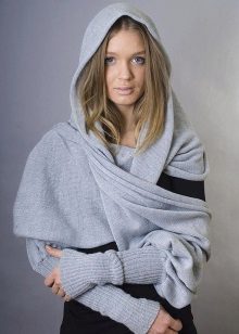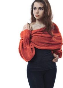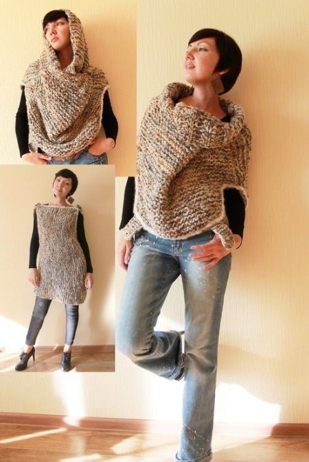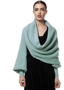 Transformer scarf can be made of knitwear, both factory and hand knitted. More often, such scarves are knitted with needles, since the crocheted fabric is less plastic. Who is it for? Laconic models of a scarf-vest and a scarf with sleeves are suitable for the office with a lax dress code. Such a thing will protect the air conditioner from the cold air, it will warm it if you freeze on the way to work. It will be nice to wrap your frozen arms and shoulders in soft folds, or wrap a warm scarf around your neck.