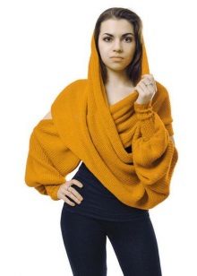Separately, it is necessary to highlight transformer scarves with sleeves or cuffs. This model appeared relatively recently - in 2008 in Italy, received the name "Sciarpone" and the recognition of Russian knitters. But the fashion for shortened models has passed, and such scarves are increasingly rare to find both on the streets and in stores. According to the design idea, the Sciarpone scarf turns into a short bolero or a sweater with a hood. Laconic boleros of Anna Serdyukova over tight-fitting knitwear will be appropriate in casual style, and paired with a cocktail dress will create a romantic look.