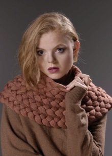 There are scarves that transform into cozy knitted necklaces, and if you use a hairpin or brooch, they become a very extravagant and fashionable accessory today - a harness. This scarf is made of knitted cord. It is plastic, will allow its owner to show imagination and taste. It is best to combine this accessory with plain shirts, turtlenecks and light tops with a simple silhouette. The work of a master from Bulgaria Biliana Petkova.