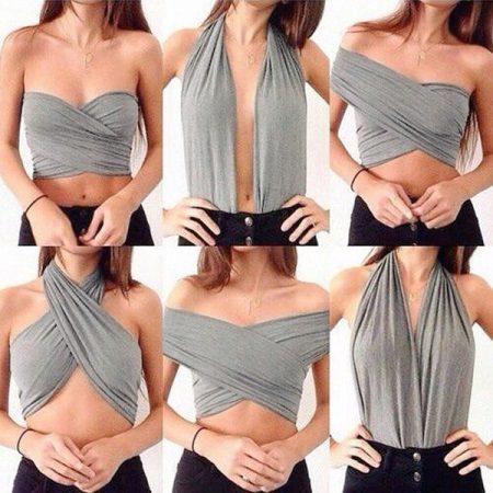All these models are distinguished by comfort, warmth and a desire to warm themselves in the autumn-winter period. But there are transfer scarves for the summer and even for the beach seasons. An ordinary scarf from dense knitwear is easy to turn into a top. No! In 6 different crop tops! The model will be relevant for those who travel light. There are options for city walks and seductive bows for beach parties.