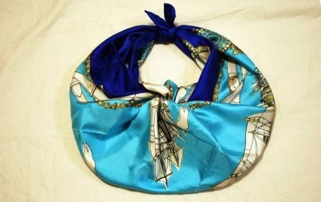 This is a very functional thing for the summer, however, it is suitable only for girls with an ideal figure and a certain amount of adventurism.Perhaps from such a scarf You can also make a handbag over your shoulder - Furoshiki. Just a couple of knots, a couple of minutes and you will join the Japanese art of origami from fabric. Light and soft, Furoshiki will probably be your favorite bag for going to the beach, or for unplanned shopping. The Japanese pack into cloth purchases in company stores and items during a trip to the bathhouse. In Russia, such a bag is still exotic.