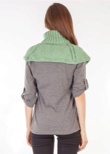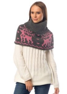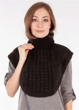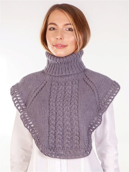 The traditional model of the shirt-front is a short poncho, slightly covering the shoulders, equipped with a high neck, tightly fitting to the neck. However, today there are also more voluminous options (close to a snood or a scarf-pipe) that create a multilayer effect. Such accessories can be transformed into a hood if desired. Traditionally, shirt-scarves are knitted, it can be both small and large knitting with various patterns.