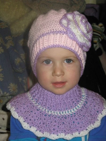 Crocheted shirt-front for the girl looks cozy and cute - a wonderful option for the fall. A gentle light shade of lilac color is combined with a white insert and a wide edging of cloves. The scarf is combined with a hat of a similar texture and color scheme, decorated with a lovely knitted flower.